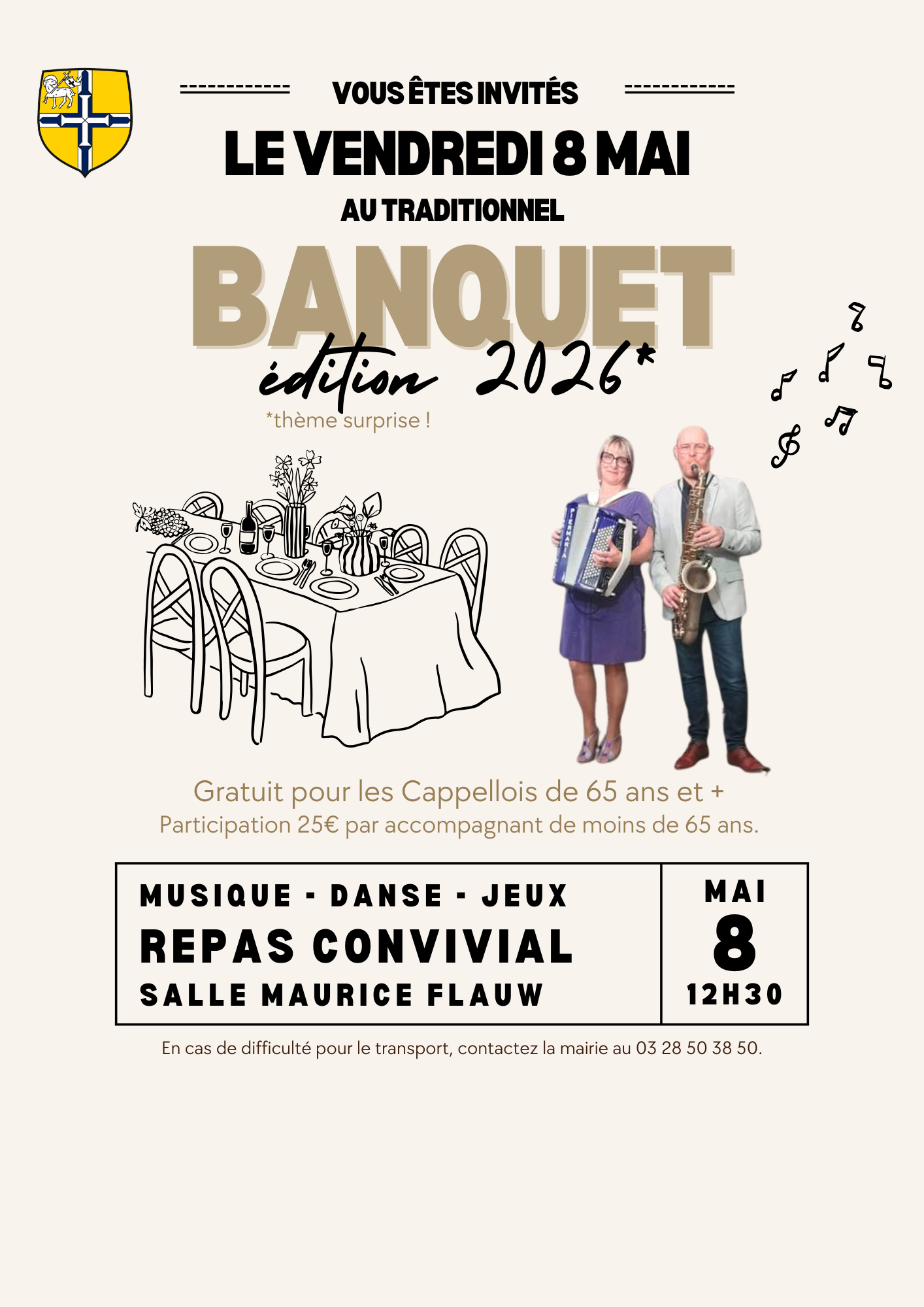 Vendredi 8 Mai 2026 Le traditionnel repas aura lieu le Vendredi 8 Mai 2026 salle M. FLAUW à 12h30. Les personnes de + de 65 ans n’ayant pas reçu d’invitation sont priées de se rapprocher de la Mairie. Inscriptions avant le 15 avril. Retour à la liste Retour à la liste