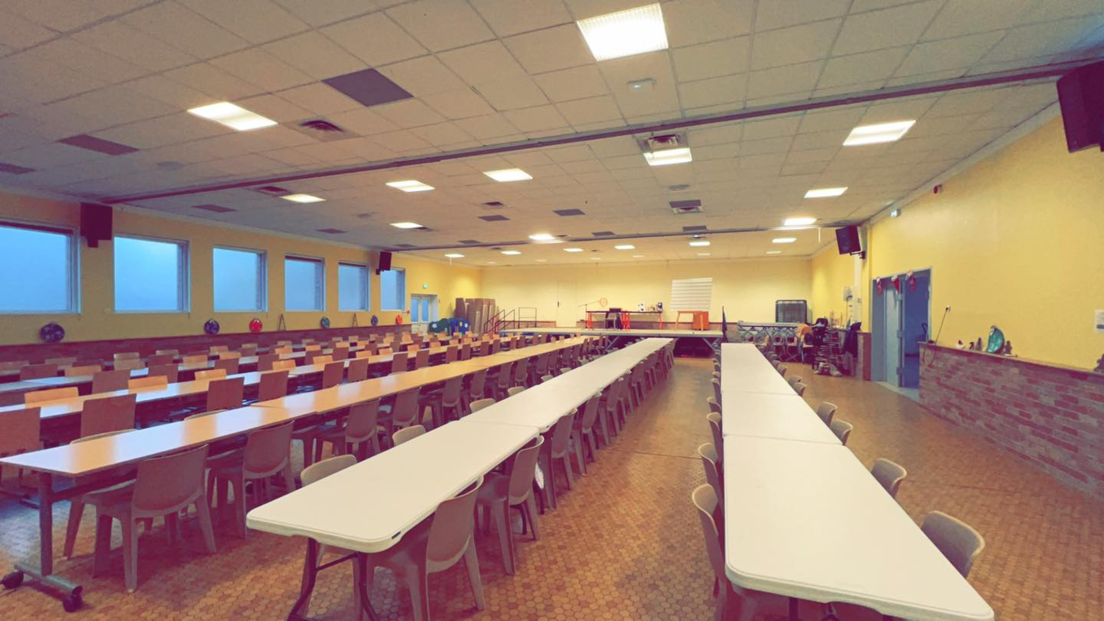 La salle principale peut recevoir jusqu’à 250 personnes pour un vin d'honneur, et un peu moins pour un repas assis (maxi 200 pers.). L'utilisation de la cuisine est en option (voir tarifs).